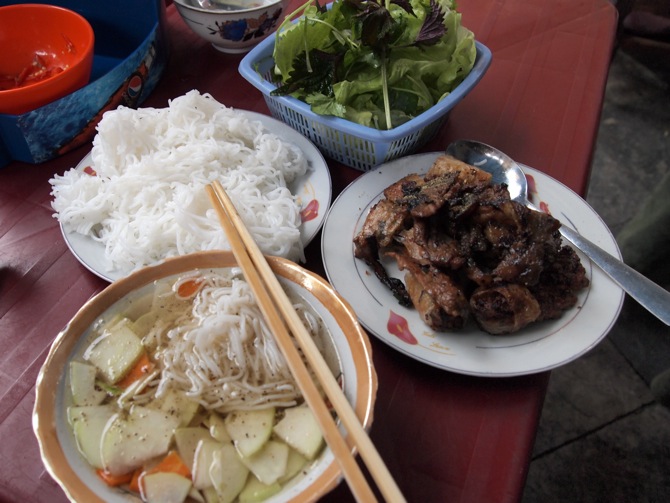 My trip to Vietnam would not be complete without bún chả. The meal consists of a basic peppered meat broth flavored with julienned carrots and daikon, a root similar to ginger. A thin vermicelli rice noodle is added to the soup along with miniature grilled pork meat patties and fried pork rolls. Greens are served along with it, such as coriander, mint, and butter-head lettuce. I liked to put some noodles, beef and carrot in the butter-head lettuce to make a little wrap. There is so much flavor in this dish, from the smoky meat to the tart daikon and buttery, tender noodles.