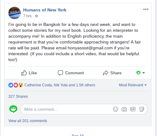 The post about his visit, published on Friday, said he is looking for stories for an upcoming book, as well as a Thai interpreter who doesn’t mind talking to strangers about their innermost thoughts and feelings to collect the very intimate stories the blog is famous for.