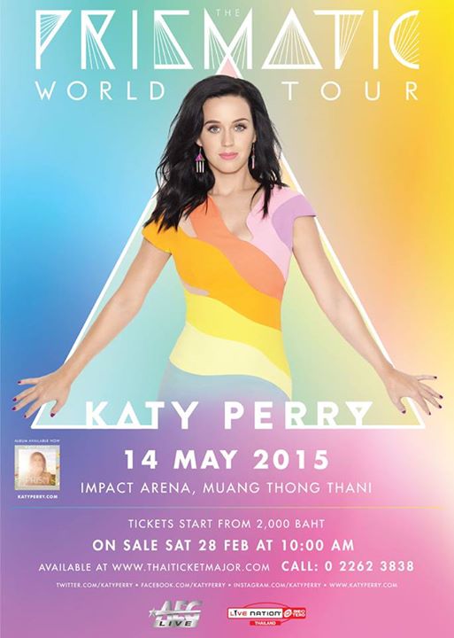 Singer-Songwriter Katy Perry will appear live in Bangkok for the first time for her “The Prismatic World Tour” at Impact Arena on May 14. No need to say more than here comes your chance to sing along with Perry’s hit singles from Prism and Teenage Dream albums such as “Roar,” “Firework,” “Last Friday Night” and “The One that Got Away.”