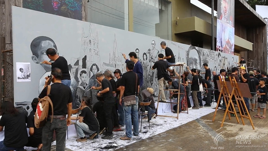 The art piece and tribute, in Chiang Rai, was directed by national artist Chalermchai Kositpipat. The painting tells the story of the life of the late King Bhumibol. It takes viewers through his childhood in Switzerland through his time in Thailand, wedding, monkhood, throne accession and his lifetime of good works for his people.