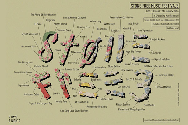 Tickets are currently on sale at an early bird rate of THB1,000 through Dec. 31, after which they will be THB1,500. Tickets can be purchased by wiring money to SCB Bank Kamonwan Karunanon at branch Sukhapibal 3 account No. 160-277486-5. Email your transaction slip, name and phone number to ticket.stonefreemusicfestival@gmail.com, and a ticket code will be sent to your e-mail. Bring your ID Card or Passport and pick up your ticket at the festival on time. Attendees must arrive during the registration hours, to be announced.