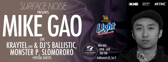New music store Surface Noise by Sneaka Villa brings LA-based producer Mike Gao – who has already played twice at the prestigious Boiler Room – to Bangkok. He will be supported by three local DJs. Expect a night of Hip Hop, Beats, Breaks, Funk, Trap and Bass Music.