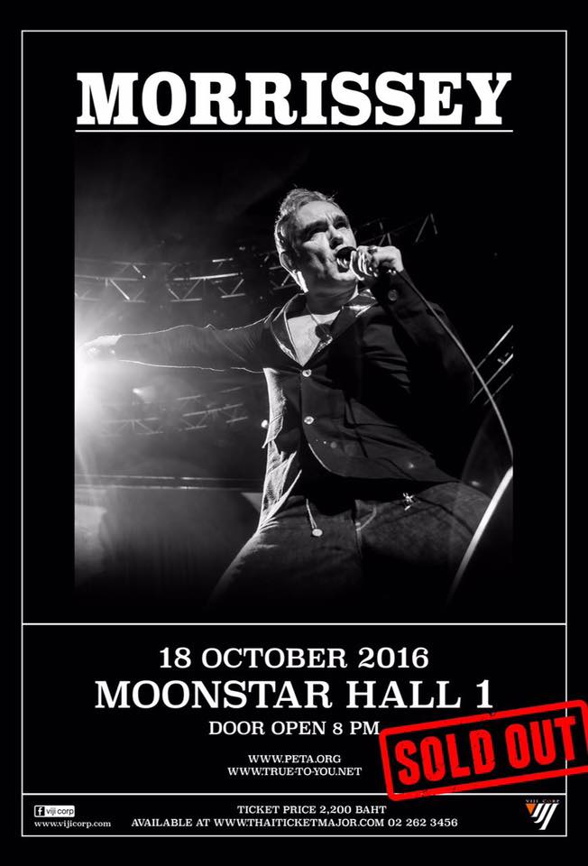 Former frontman of The Smiths and notoriously angsty singer Morrissey will appear in Bangkok next Tuesday at Lat Phrao’s Moonstar Studio.