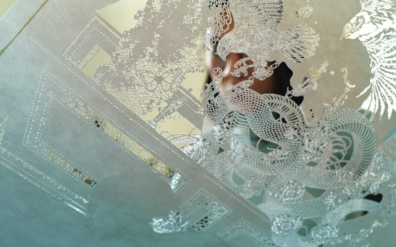 LGBT artist Narath Boriboonhiranthana, known for expressing her “fragile self and unforgettable memory,” creates Art Nouveau-inspired artwork using perforation techniques performed by knife.