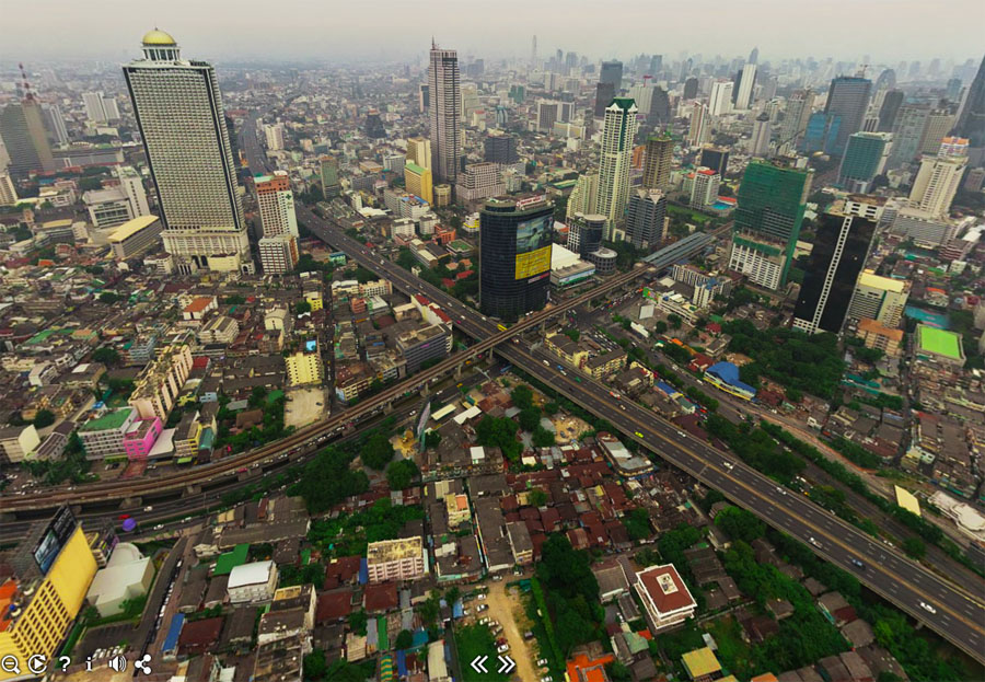 It’s a combination of those panoramic and sphere images if they were taken by a bird. A bird with muscular wings and thumb-claws. Online host Airpano.com has a number of high-res scenes from the sky over Bangkok.