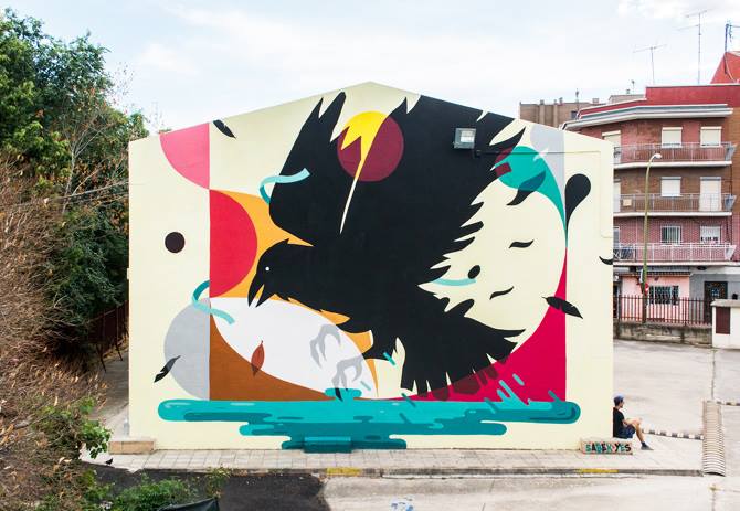 Sabek’s art uses large-scale murals to depict nature and animals in relation to the urban environment, while J.M. Yes focuses on geometric figures, playing on lines, colorful shapes and tangents.