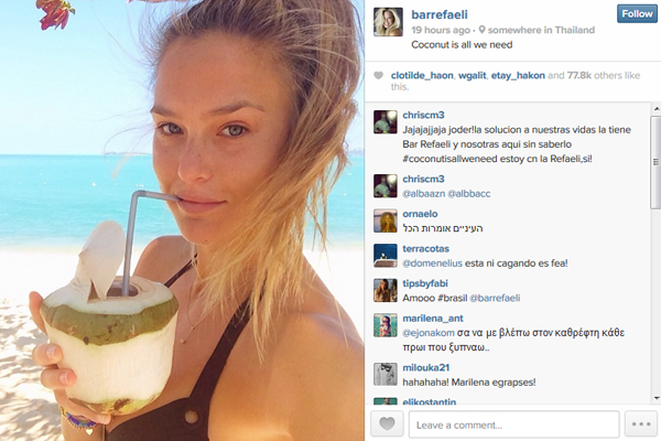 Israeli fashion model Bar Refaeli shared a photo of herself at a beach in Thailand last night via Instagram.