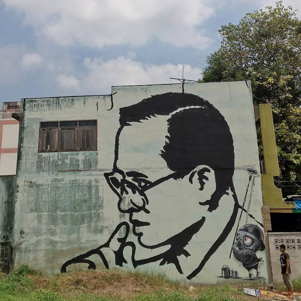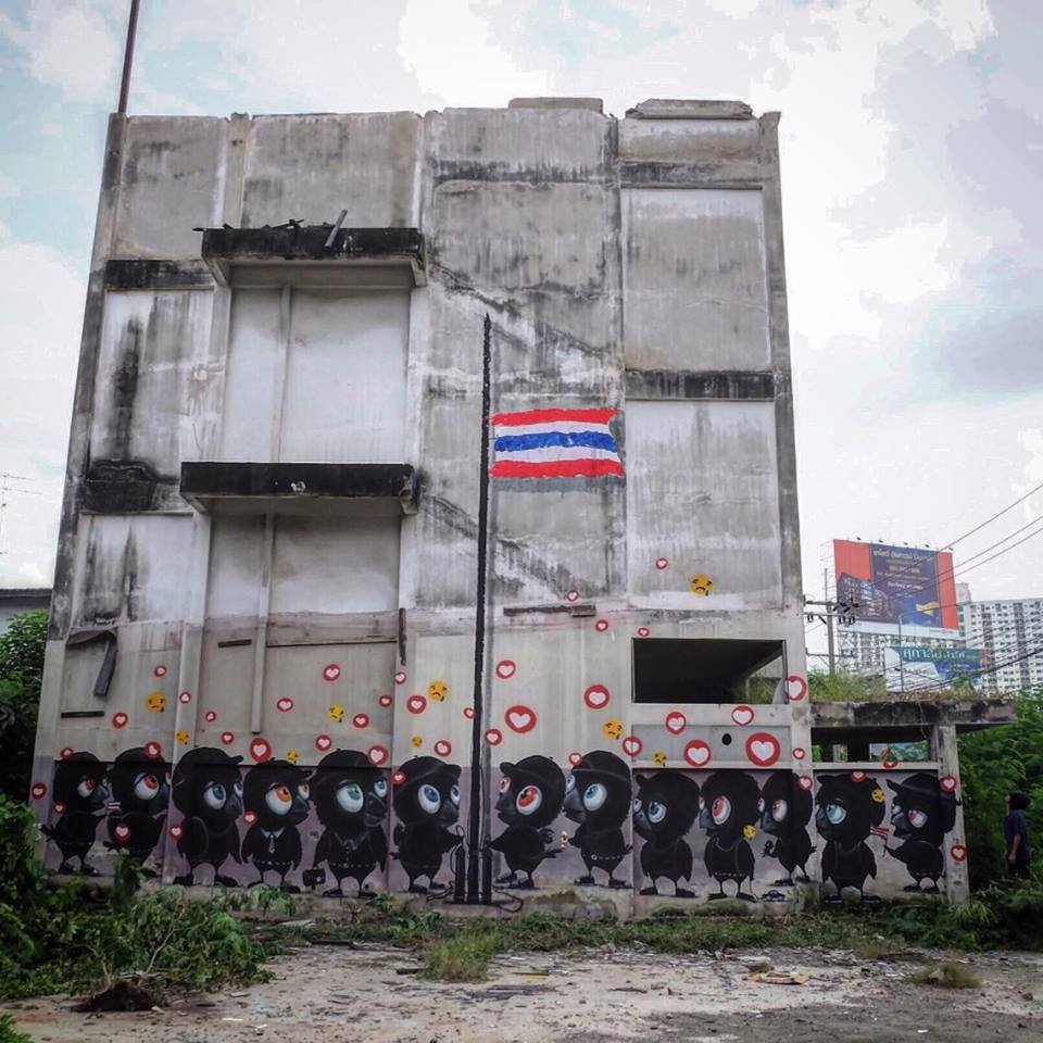 When asked about his feelings for the late king and why he chose to use his bird character in all of these murals he told Coconuts, “Power makes a human know what sacrifice means…or power makes a creature who cannot fly pick up pieces of woods and connect them together in order to paint on the wall five times taller than him for three hours to express his deep sorrow.”