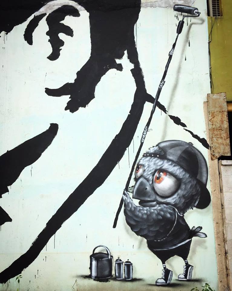 In typical Bon style, he painted one of his own signature bird characters in the lower right corner with a roller brush, as if the bird was responsible for the touching tribute.