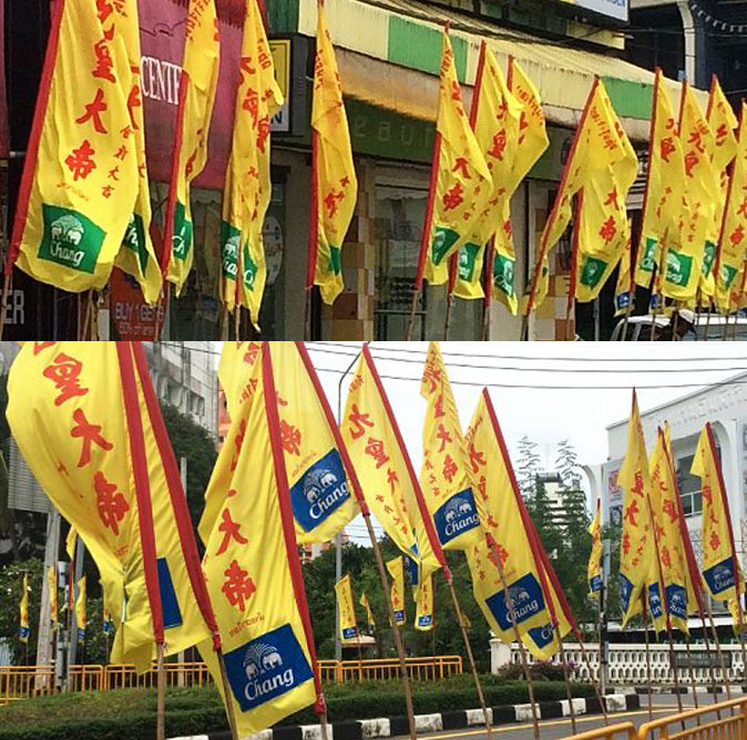 After a megabrewer got into hot, sudsy water for plastering its logo on flags promoting Phuket’s Vegetarian Festival – a famously “dry” holiday – it quickly sought to resolve the issue with a color change. Because blue means water, got it?