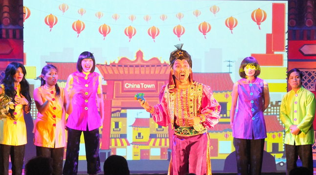 In this rendition of Aladdin, the role of Widow Twankey is hilariously played by Michael Allman but his costumes still nearly stole the show. In the opening scene, he’s sporting a headdress made of an item familiar to every Bangkokian: a plastic spinning rack with clips for drying your unmentionables. The rack spins and turns as he shakes his head. In his next appearance, he’s wearing a plastic basket on his head filled with detergents and other washing items. With the addition of heels and headdresses, he towers over the rest of the cast.