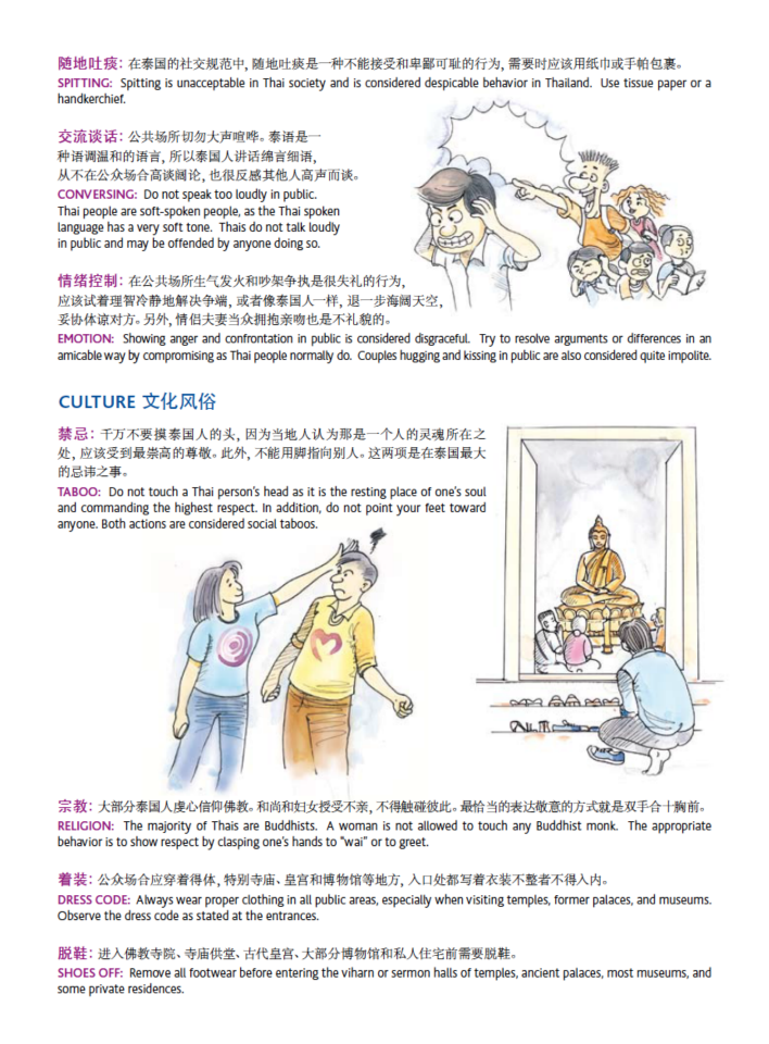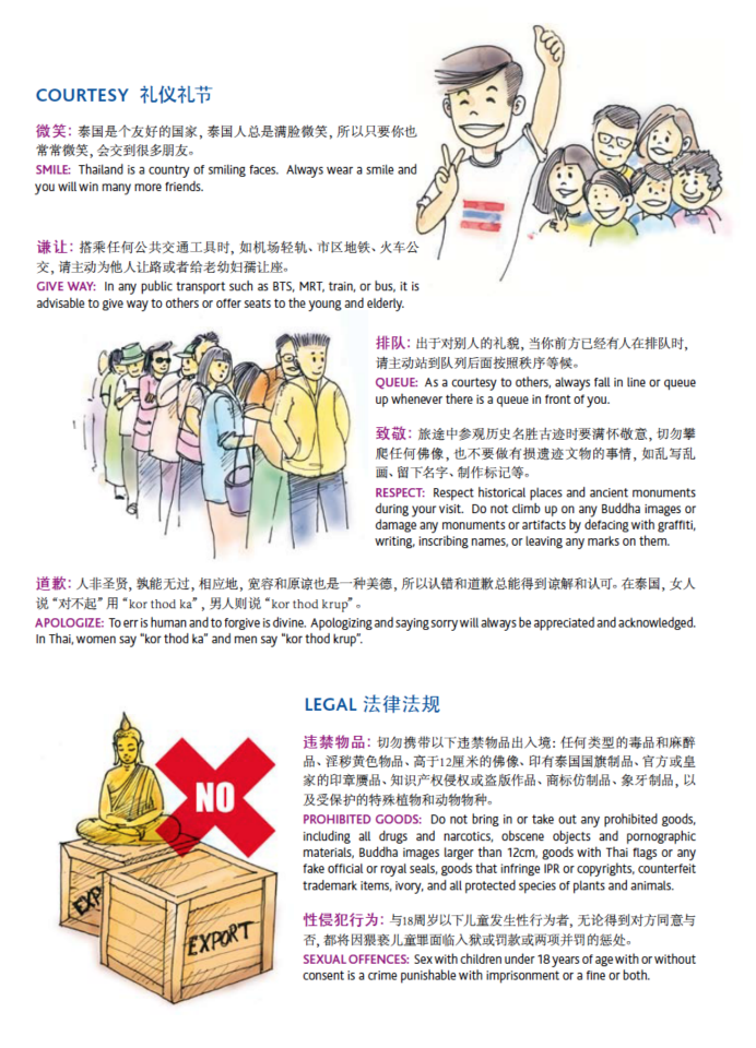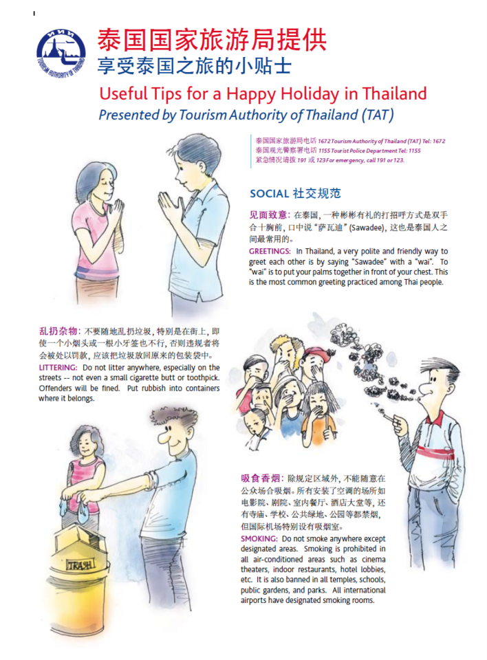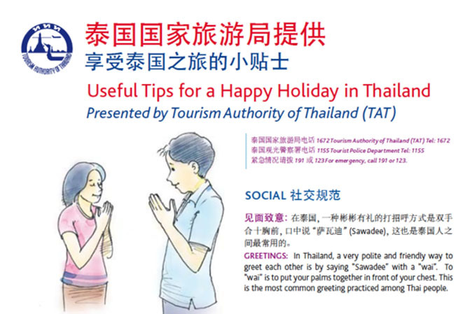 The leaflet, which is in Chinese and English, has cartoon illustrations and aims to educate Chinese tourists in a friendly way rather than scolding them about how to behave, according to Warapa Angkarasirisap, director of the tourism authority’s East Asia Market Division.