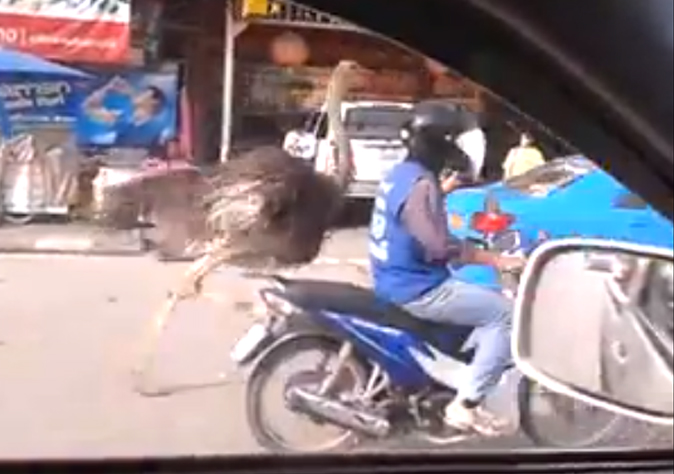Facebook user Sukchi Kas posted a short clip of the bizarre event he encountered on the Teparak road on Wednesday. It’s just that, an ostrich on the loose in Samut Prakan’s Bang Phli district.