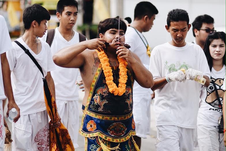 A spirit medium locally known as “ma song” joins a huge street procession through Phuket Town yesterday. Photo: Guy Houben/ Coconuts Media