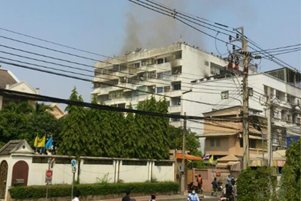 The fire started on the seventh floor of Pinklao Condo, located near the Chaophya Hospital. Fire fighters were able to contain the blaze after about 40 minutes, and the trapped residents were evacuated from the roof by a ladder truck. No injuries were reported.
