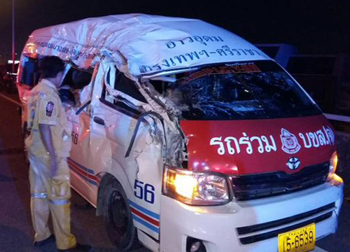 The driver, Lekpetch Prasert, 46, told police he picked up 14 passengers from a minivan terminal at Victory Monument and he lost control on a curve before the right side of the minivan hit the barrier, dragging the vehicle about 50 meters farther down the road.