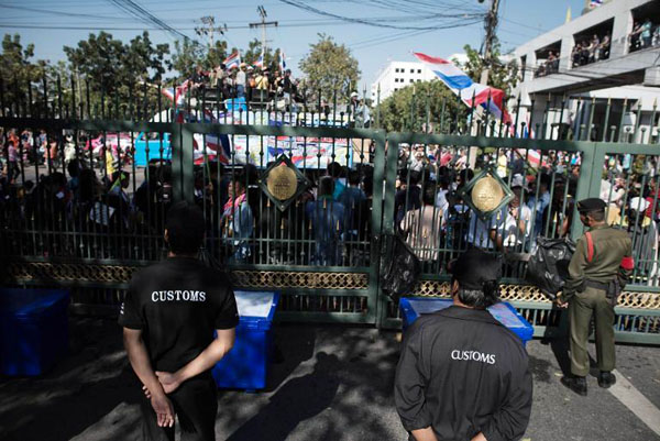 Several thousand demonstrators gathered outside the Thai customs department early Tuesday to try to prevent staff from going to work.