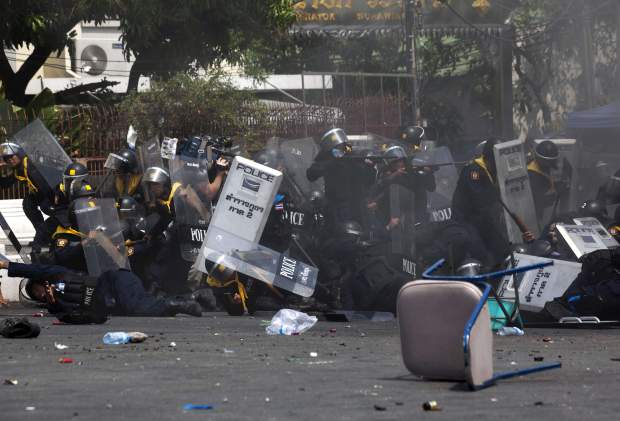 Injured police officers sprawl on the ground as their comrades return fire after a grenade was thrown into their ranks by anti-government protesters at Phan Fah Bridge in Bangkok on Tuesday, Feb. 18. Photo: AFP / KC Ortiz