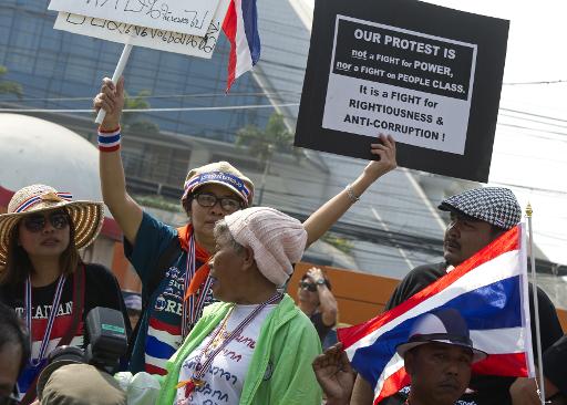 Thai anti-government protesters hold placards during a rally in Bangkok on January 27, 2014 Photo: Pornchai Kittiwongsakul
