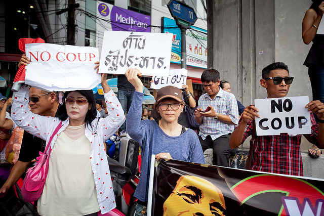 According to tweets addressed to members of the media, the students have set up a protest group they’re calling the “Thai Student Center For Democracy.” In their message, the asked members of the public to gather at 2:30pm today at the Faculty of Liberal Arts to read a group statement pressuring the military to nullify the coup.