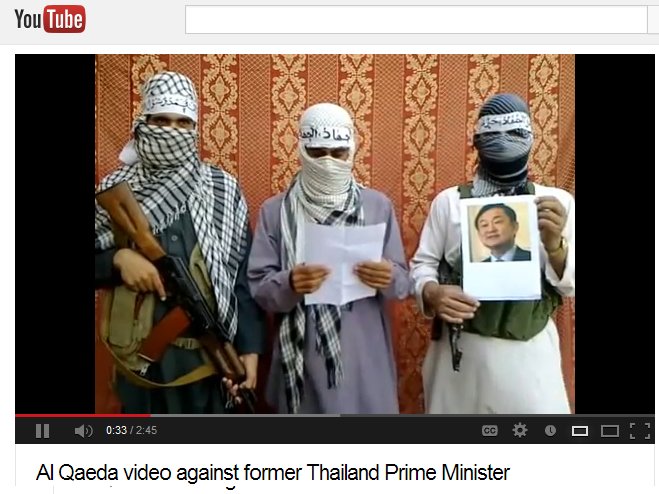 An ill intended birthday present for ex-Prime Minister Thaksin was loaded to YouTube Friday. The producers of the 2:45-minute video entitled “Al-Qaeda video against former Thailand Prime Minister Thaksin Shinawatra,” are shown wearing Middle Eastern robes with faces covered. While one man is armed with what appears to be an AK-47 assault rifle another holds an image of Thaksin. The video was spoken in Arabic and English.