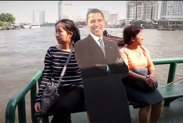 In footage, American and Thai embassy staffers, including Ambassador Kristie Kenney and a less-than lifelike Barack Obama, go about their daily activities while showing seemingly random Thai characters.