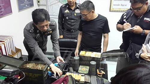 The soldiers were arrested at 11pm after attempting to drive past a police checkpoint on Langsuan Road. An inspection of their vehicle discovered a handgun, M16 rifle, and M4A1 rifle and a large cache of ammunition.