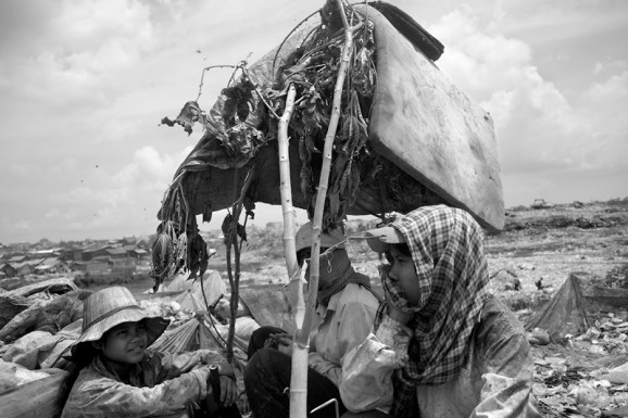 Steve documented the daily lives of these Cambodian slum dwellers living way below the poverty line. The rubbish pickers live in the surrounding slums and makeshift huts on private property surrounding the dump, succumbing to exorbitant rents by the landowners. Comprised of about 2,000 people including roughly 600 scavenger children, this small but growing population is perceived as less than human, and marginal to mainstream Cambodian economy and society. They not only live on the the property surrounding these garbage dumping grounds, but they actually make their meager living off of the mountains of disposed waste. It was a real eye opener to see images of kids picking at the piles of garbage and even eating from their spoils.