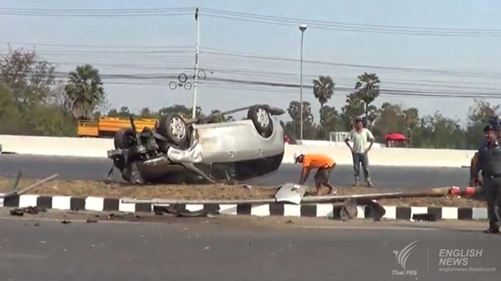 The driver told police he lost control of the car as it was approaching Ban Khao Tamone in Petchaburi’s Ban Lat district, which crashed into the pole and overturned.