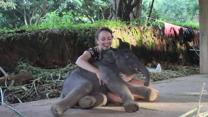 This two-week-old baby elephant was overcome by jealousy when her caretaker Allie was talking to another human and ignoring her, so she pretends she can’t stand anymore and falls on Allie’s lap.