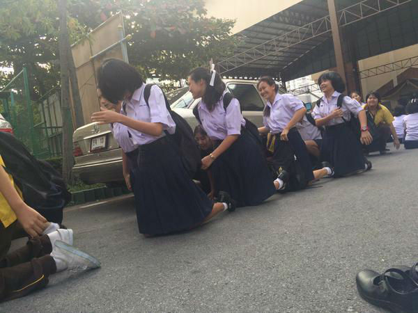 Young students at a Khlong Toei-area school are being punished for tardiness by being made to crawl to their building on the concrete floor as seen in photos shared online.