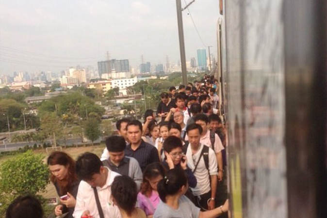 At 9am this morning, the Airport Rail Link transferred an entire crowded train to another train by foot between Makkasan and Ramkhamhaeng station, after the train had stopped working and they had spent an hour trying to fix the problem without success.
