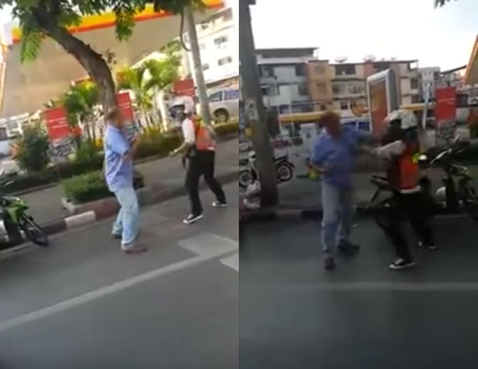 A new viral video shows taxi drivers of four and two-wheeled vehicles battling it out in the middle of Sathon.