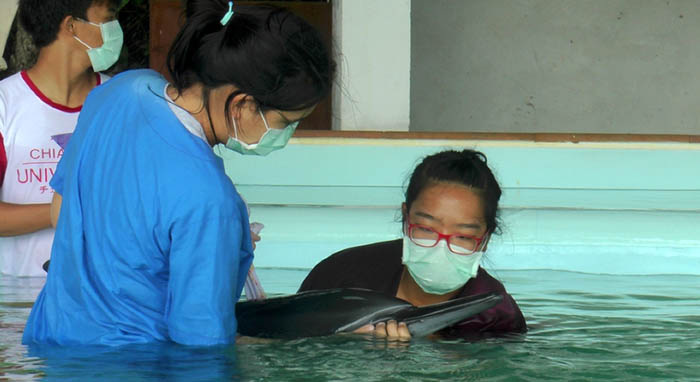 “We believe the dolphin has a blood infection,” one staffer told The Phuket News. “She might have been too weak to stay with her school and eventually beached by the strong wind and currents brought on by the southwest monsoon. “We will do our best to make sure she makes a full recovery and keep her here until until she can swim well on her own.”