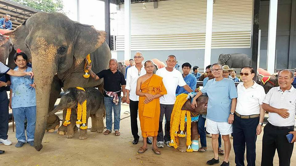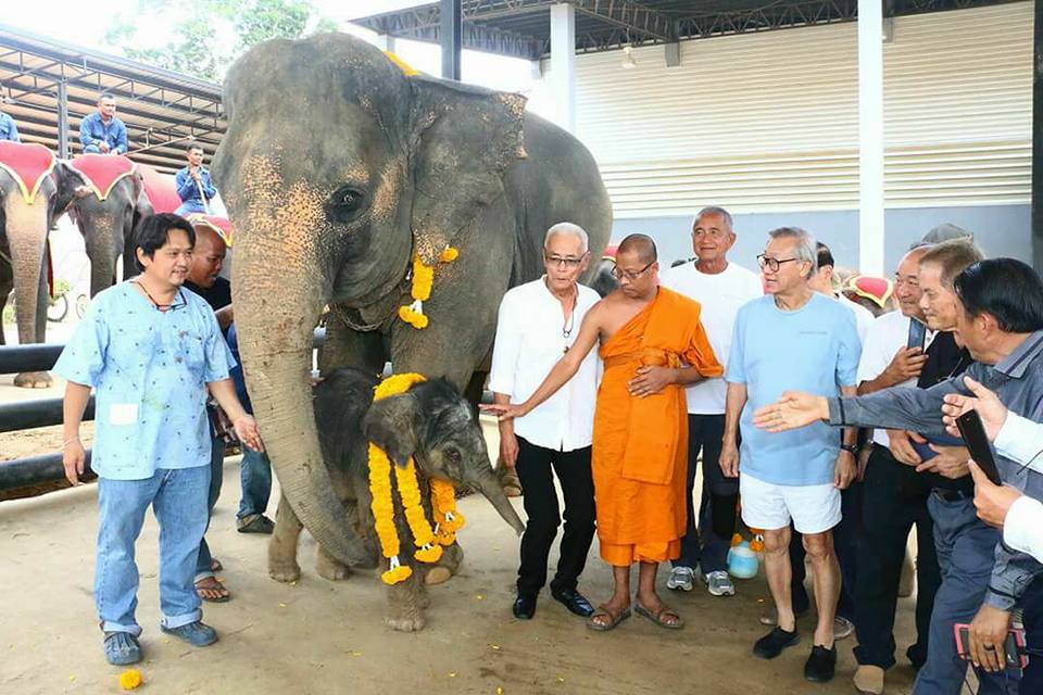 Plai Nammon is only the fourth elephant born in the Pattaya park in the last four decades. The small gentleman was greeted by monks and enjoyed a blessing ritual by Wat Samakkheebanphot abbot Phra Khru Kasemkittisopon.