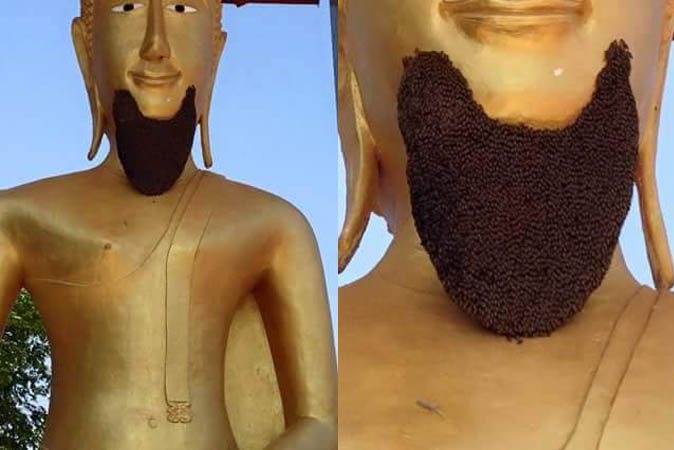Thousands of bees worked hard to build a hive on the chin of a big Buddha at Wat Pa Na Dong in Bueng Kan province, creating a new Buddha gesture – the goatee.
