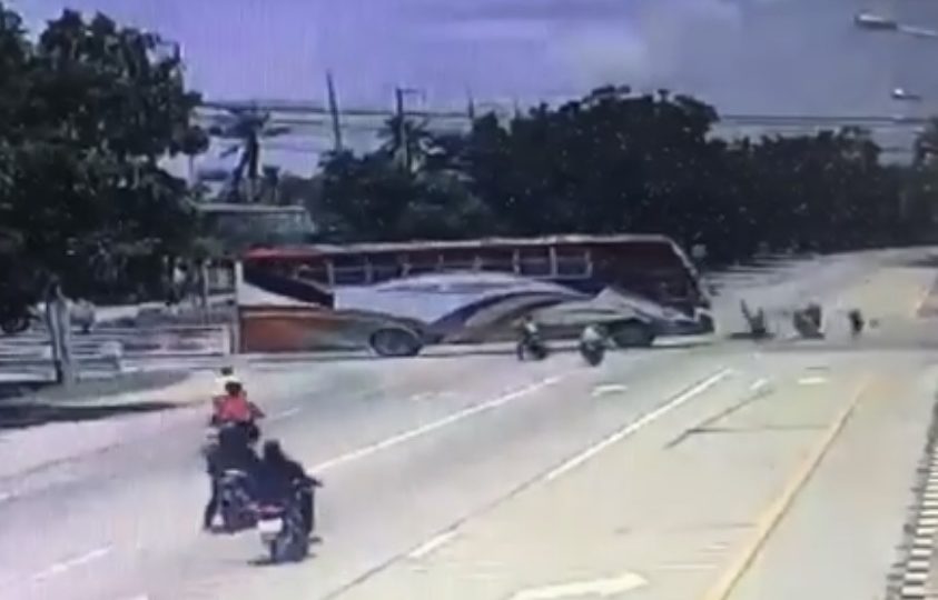 Police this morning charged the truck and bus drivers for recklessness after the riders died at an intersection on Highway No. 340 in Suphanburi’s Si Prachan district, police there said today. Footage of the incident shows a group of bikers speed toward the gap between the vehicles – the truck was towing the disabled bus – when the lead rider peels off just before his three compatriots are clotheslined by the tow line.