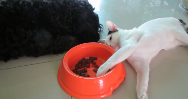 The cat was being sneaky as she dipped her little paw in the bowl and quickly played dead when the dog turned at her.