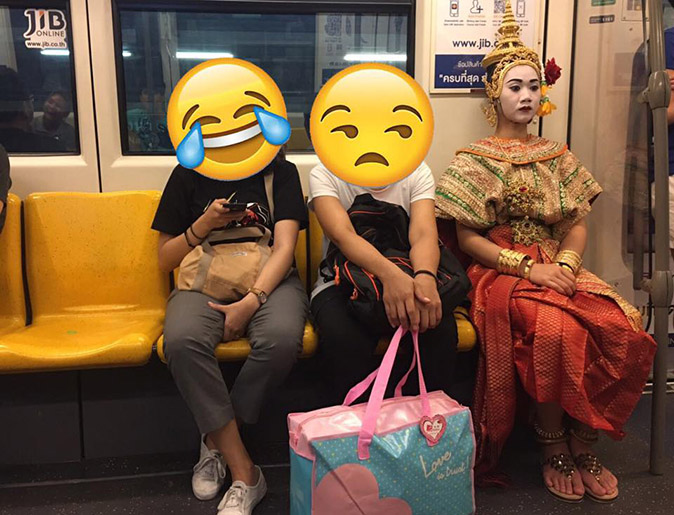 The young woman, who’s dressed as if she’s a puppet from the traditional shows at the Artist’s House, has been spotted riding the BTS from Siam to Saladaeng at night over the past few days. After that, she’s seen walking toward Lumpini Park.