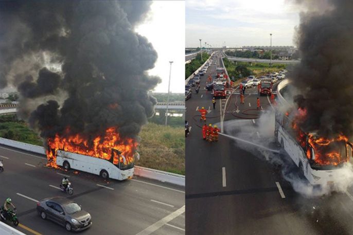 Rattana Jenraksa, the bus driver, said he saw smoke coming out of the engine, so he pulled the vehicle to the roadside and told all 20 passengers to exit at about 7:30am today.
