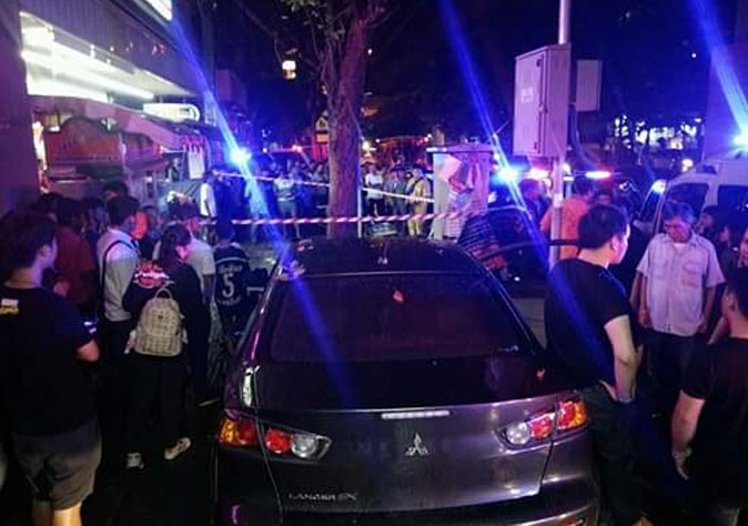 His Mitsubishi ran over a woman Napaporn Sripawathakul, 25, who died at the scene. The taxi driver, Prayoon Tantanakchareon, 60, and an unidentified male passerby were also injured and sent to Rajavithi Hospital.