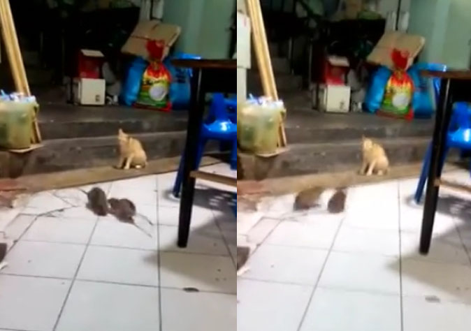 “The rats are fighting and the cat is just watching. The cat is scared of rats?” Namo narrated the video.