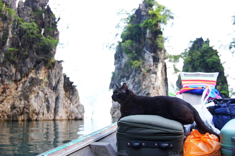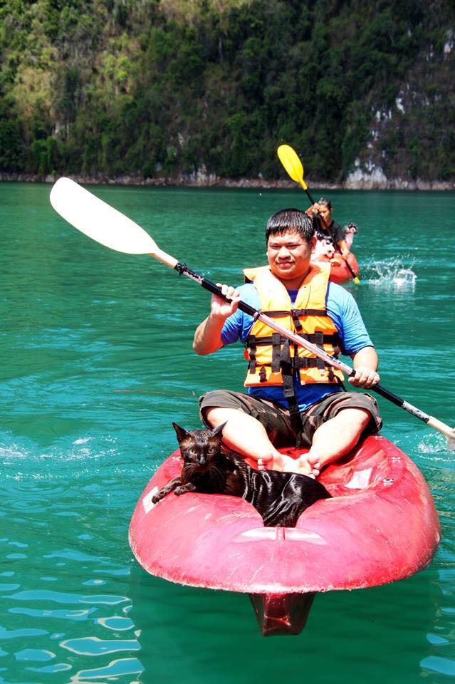 Celebrity cat “Johnny” is taking a break from the spotlight and picking up swimming during his vacation to burn some calories.