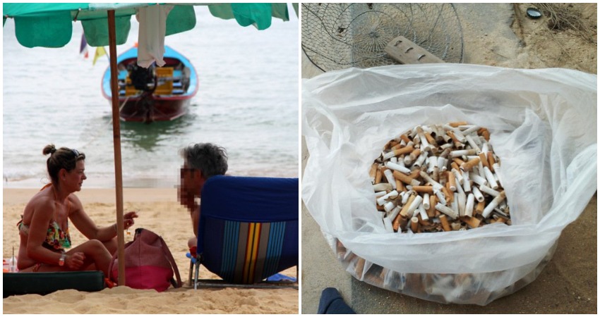 Local tambon chief MaAnn Samran said he was unaware of how bad the problem of cigarette butt litter at Surin Beach was until he recently saw photos of how many butts had been picked up by a citizen at the beach in just 30 minutes earlier this week.
