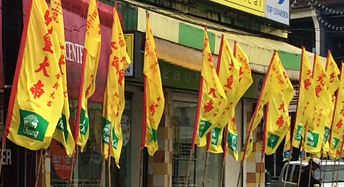 No place takes the Vegetarian Festival more seriously than Phuket, where many unusual and bloody rites are observed, along with an abstinence from alcohol. Therefore a popular brewer is in trouble this year for plastering its logo all over the distinctive yellow-and-red flags raised throughout Phuket Town.