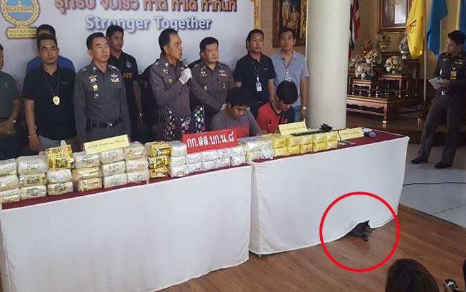 Facebook user Thanakorn S. Camerarock posted some pictures to the “Love Dogs” Thai Facebook page. These photos were from at a recent press conference about a drug bust that showed all the usual suspects: Thai police, a pile of drugs and some former drug dealers looking depressed. But, this time, the police had a helper.