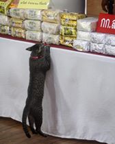 Later, the cat came out of it’s hiding place and got a good back stretch along the height of the table while also performing a closer inspection of the confiscated drug haul.