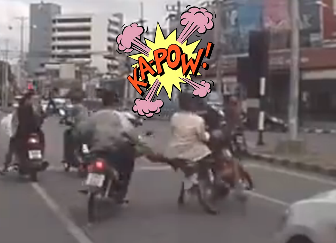 In a video filmed in an unidentified locale, a motorcyclist veers in front of two other men bearing down on a frightened looking woman. According to the caption at Live Leak, where it was posted yesterday, the men had attempted to snatch the woman’s purse. After knocking both of them to the ground with a muscular, barefoot kick, hellfire rains from the skies via Mr. Vigilante’s fist, leaving one of the suspected perps a quivering mass of fear and regret.