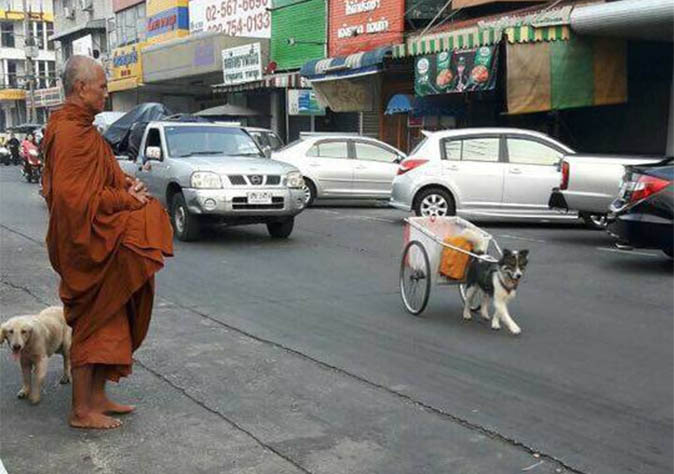 The sight of a monk using temple dogs to pull a food cart during morning alms no longer elicits smiles from locals after they noticed how exhausted the animals looked.