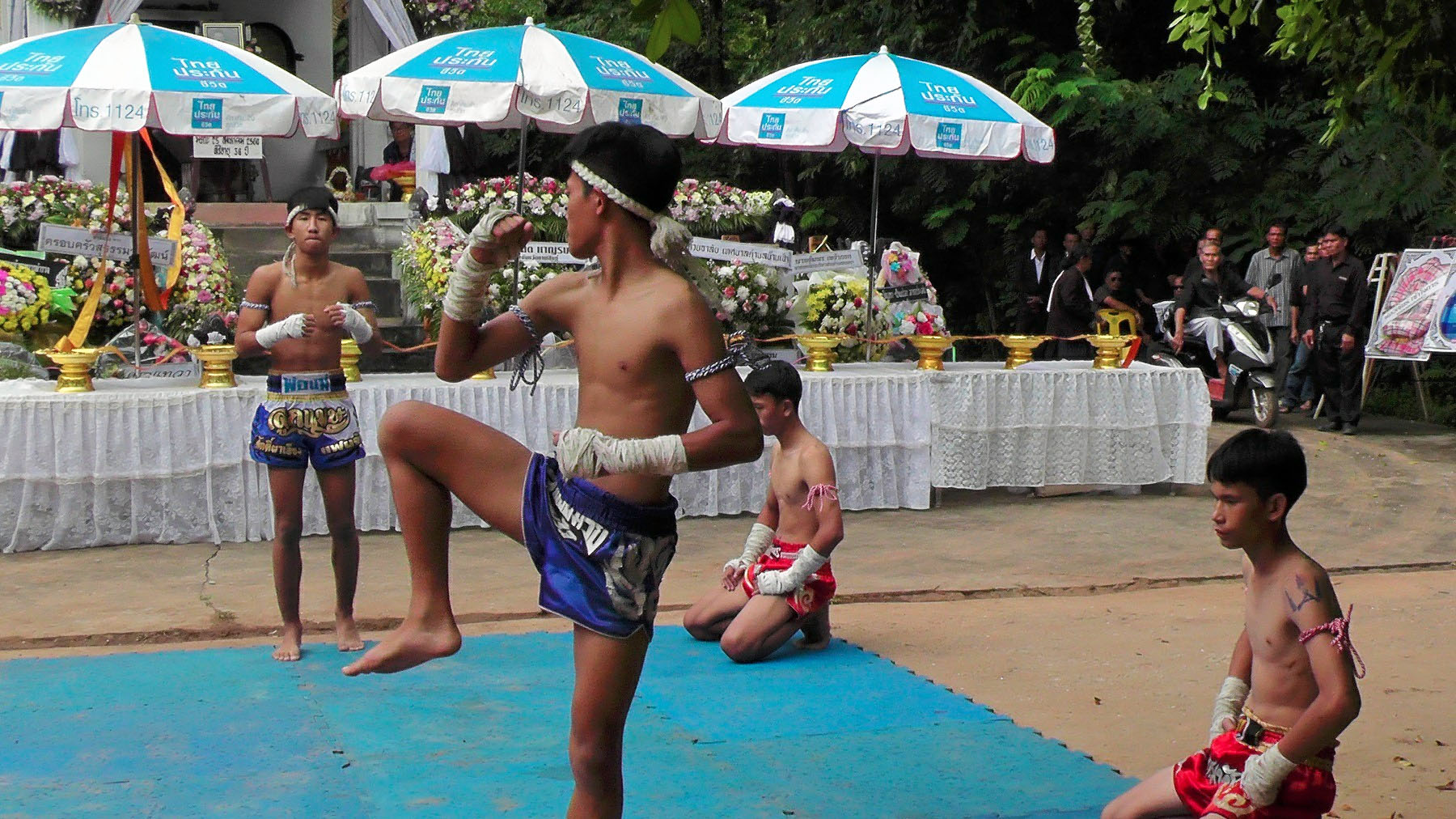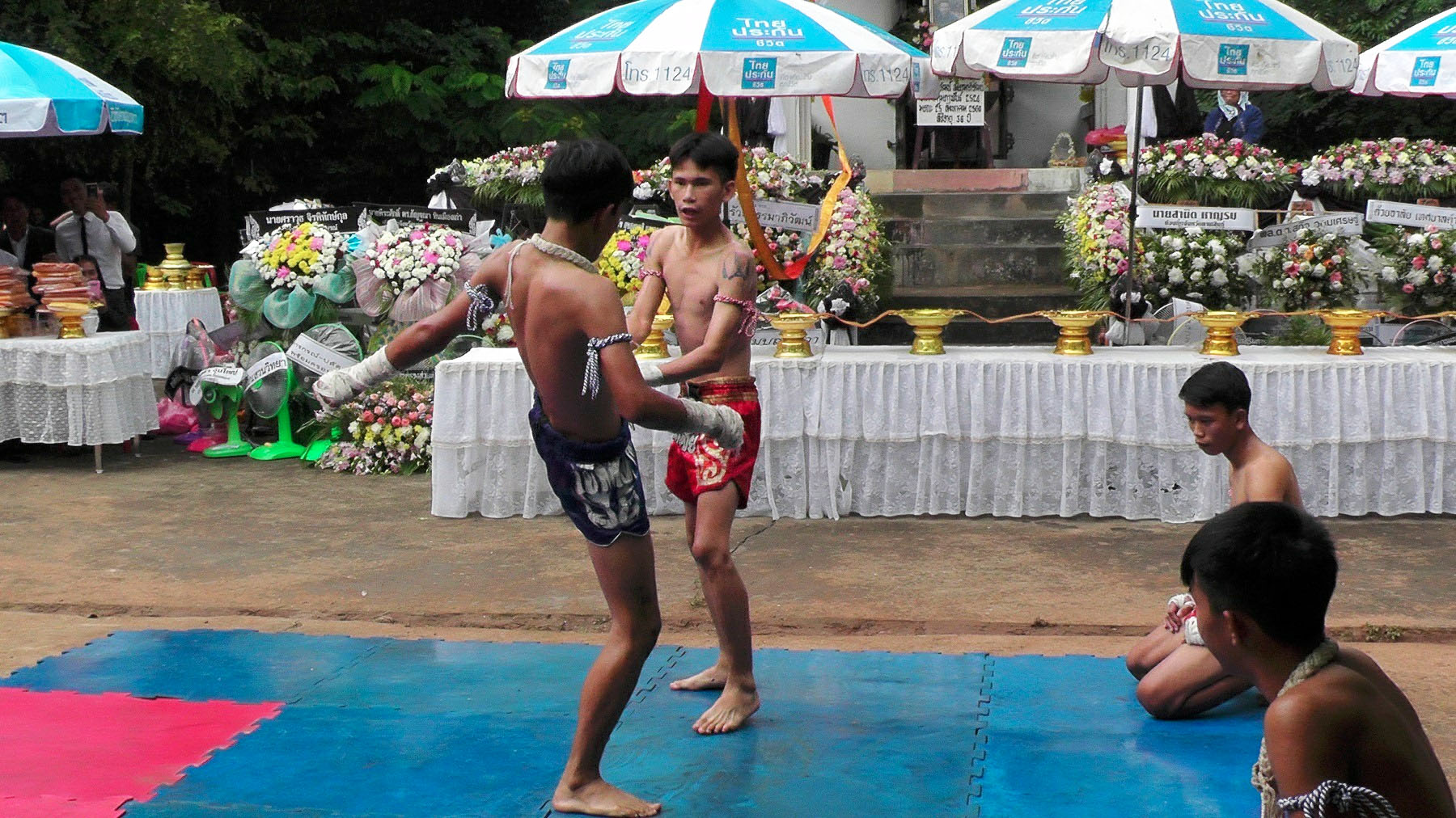 A funeral held in Thailand’s rural Chaiyaphum province yesterday made headlines in local media. On the day of the cremation, two pairs of Muay Thai fighters fought before the deceased’s body to honor the fact that Netthawan Suthammapiwat loved Muay Thai all his life.